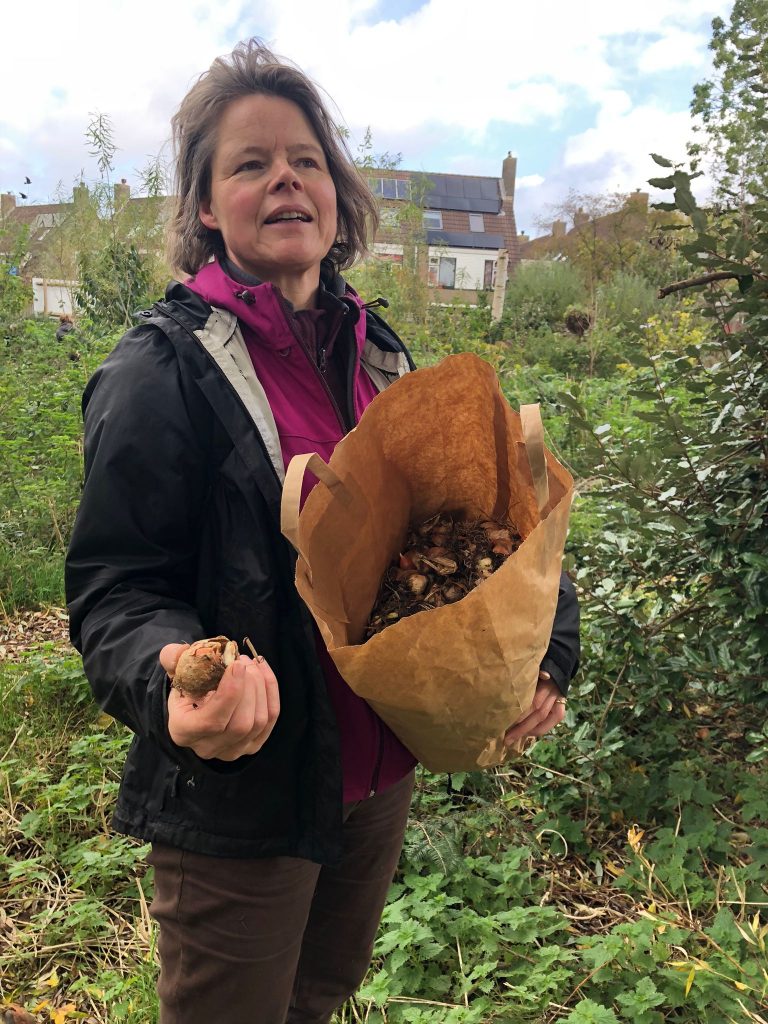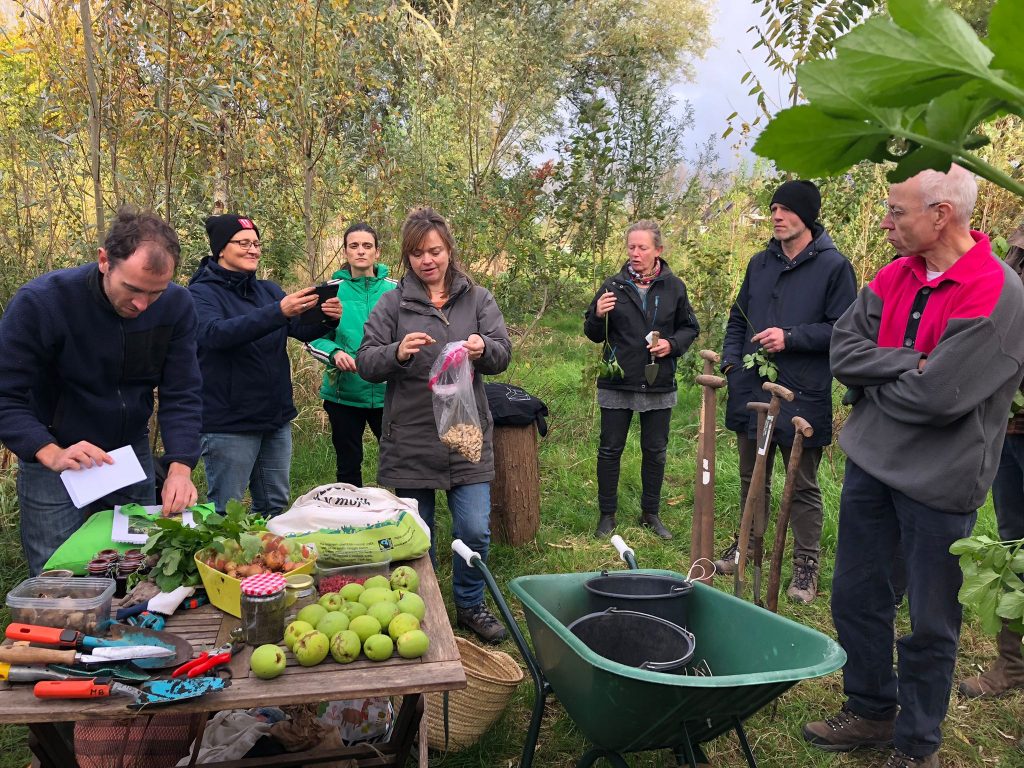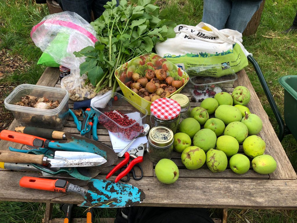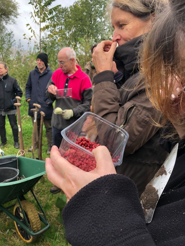 Ant kwam nog met een zak vol bloembollen uit het bollenasiel, dus dat wordt een vrolijke boel in het voorjaar. De oogst verdeelden we: chinese kwee, szechuanpeper, fazantenbes, mispels, zwartmoeskervel en van vorige keer: appelbesjam en brandnetelzaad. Ook brachten vrijwilligers zelf nog crosne en kweeperen mee.